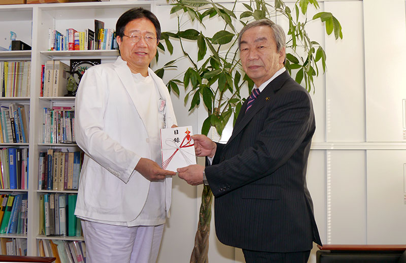 2019.7.18 越前三国競艇企業団より、研究助成金が寄附されました 平成31年2月25日(月)に、越前三国競艇企業団・坂本憲男企業長が当教室を訪れ、地域医療の充実のため、研究助成として松峯昭彦教授に寄附金300万円を手渡されました。 松峯昭彦教授は「ありがとうございます。整形外科学分野の研究のため、大事に使わせていただきます。」と感謝の言葉を述べました。